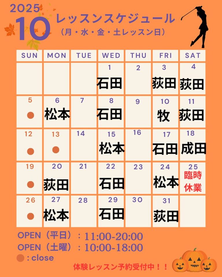 こんにちは☺ 明日からもう10月!!早いですね💦 本格ゴルフシーズン到来ですね☆ レッスンスケジュール掲載致します! プロのレッスンで差をつけませんか? 体験レッスン予約受付中!!! 052-890-7799:golffreaks@toshin-group.com:名古屋市中区錦2−12−32 さくらヒルズ錦2階:栄・伏見駅から徒歩約5分
