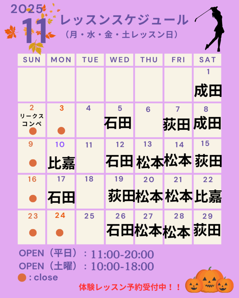 こんにちは☺ 11月レッスンスケジュール掲載致します! 体験レッスン予約受付中!!! 052-890-7799:golffreaks@toshin-group.com:名古屋市中区錦2−12−32 さくらヒルズ錦2階:栄・伏見駅から徒歩約5分