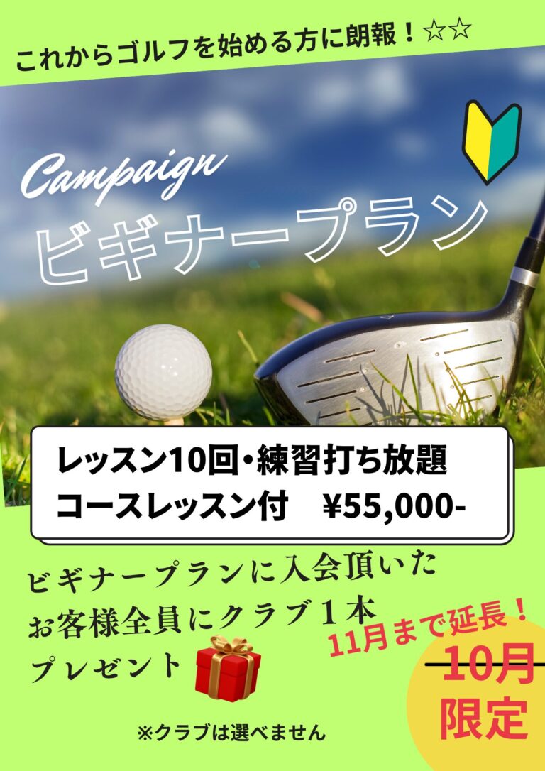 こんにちは☺ ビギナープランキャンペーンを11月まで延長致します!!! ¥55,000でレッスン10回・練習期間中し放題・ハーフコースレッスン(トーシンさくらヒルズゴルフクラブ)・クラブ1本プレゼント🎁全部ついております!! 赤字覚悟のキャンペーンです!!是非この機会にご利用ください☆ ご紹介頂きました会員様にも特典ございます🎁 ☎052 […]