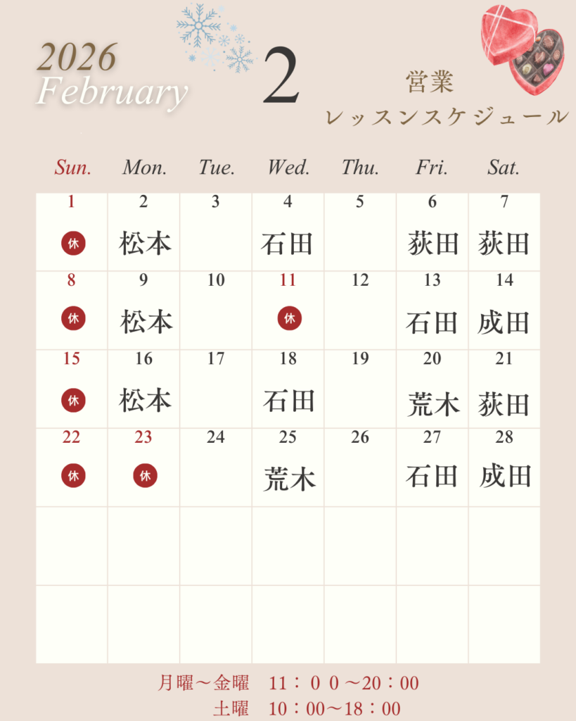 2月のレッスンスケジュール掲載致します!